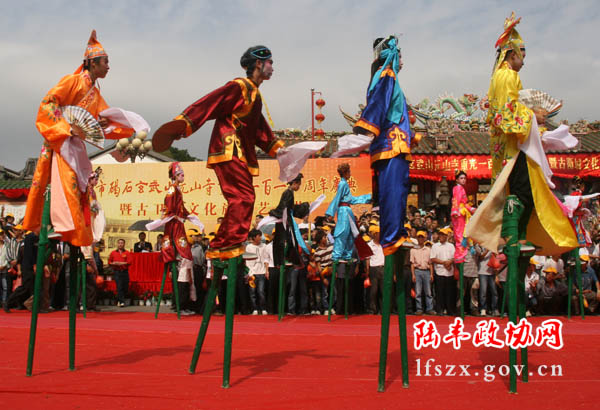 陸豐“踩高蹺”又稱“高腳景”,或稱“縛柴腳”,歷史悠久。在每年的農歷三月初三日慶祝元帝君壽辰的元興社社火廟會慶典活動中,相傳“踩高蹺”這種活動就是在社火活動中慢慢的成為必不可少的一種節目。