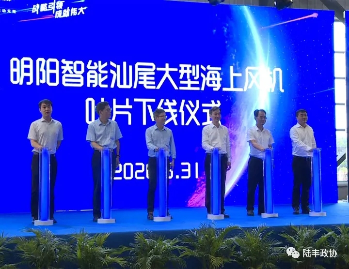5月31日上午,明陽智慧能源集團股份公司在汕尾陸豐海洋工程基地舉行明陽智能汕尾海上高端裝備制造基地投產暨首支海上大兆瓦葉片下線儀式。汕尾和我市領導林軍、許偉明、彭薏菁、歐陽柳、林義清、方炳烙、沈偉賢、林廣實,明陽智慧能源集團股份公司總裁張啟應參加儀式。