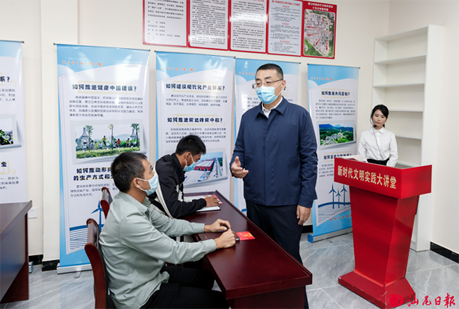 “從事非遺工作多少年了?”“對黨的二十大精神最大的感受是什么?”在碣石鎮港口村鄉村文化集市,逯峰認真觀看黨員群眾用自編自唱的漁歌、皮影戲等宣傳黨的二十大精神表演,與非遺傳承人們親切交流,勉勵大家堅定文化自信,用好用活海陸豐紅色文化、優秀傳統文化資源,堅持創造性轉化、創新性發展,開展更多具有地方特色的宣傳宣講活動,推動黨的二十大精神“飛入尋常百姓家”。隨后,逯峰到港口村新時代文明實踐站了解學習貫徹情況,并向農村黨員干部群眾宣講黨的二十大精神。他強調,要進一步發揮好新時代文明實踐中心(站)等陣地平臺凝聚群眾、引導群眾、以文化人、成風化俗的作用,積極組織志愿者、入黨積極分子等群體參與學習宣傳貫徹活動,大力開展為民辦實事活動,把實踐中心著力打造成為加強基層思想政治工作的堅強陣地、培養時代新人和弘揚時代新風的精神家園。