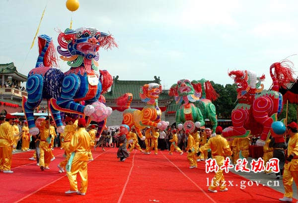 碣石“五色獅燈舞”獅身高2.8米、長3.2米、寬1.2米。“五色獅燈”內空,由竹片制成骨架裱上薄棉紙或絹布,在頭部和尾部體內安裝火燭裝置,腰身用軟絲連接,五只獅分別繪上青、藍、紅、黃、深藍五種顏色以及圖案、花紋。表演時高舉舞動并由大嗩吶、大鑼鼓等樂器吹奏正字戲昆牌子伴奏助威,同時有“五福頭”和“三扇燈”穿插舞場伴舞助興。場面生動活躍、威武壯觀,夜間點上火燭舞動表演時更加神氣活現、光彩奪目。相傳大獅能吞食世上“惡煞”,給人們帶來吉祥喜慶,因此“五色獅燈舞”所到之處,人們鳴炮、喝彩助威、熱烈歡迎,稱之為“瑞獅起舞”、“五彩獻瑞”。