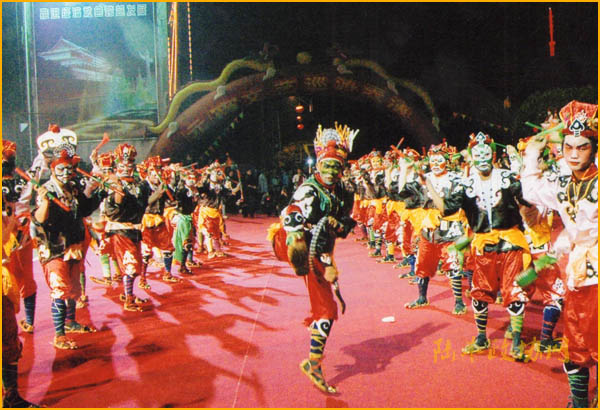 甲子英歌取材于水滸傳梁山泊好漢喬裝混入大名府營救盧俊義的故事。完整隊列有三十六天干、七十二地煞共一百零七好漢,前有手舞神蛇的時遷開道進行表演。舞臺隊列分六隊,分前24人(即八卦24純陰),后12人(即八卦12純陽),由李逵、楊志等36好漢領隊。他們畫不同的臉譜,頭戴雉尾雙龍武生冠,身著白襟環花束袖黑衫,腰束腰牌兵器,腳踏側佩鈴草鞋,手執雙棍或單小棍和小鈴鼓,隨著“咚咚咚,隆咚咚”的鑼鼓節奏,邁著傳統武當太極蜈蚣步子,步調一致,齊聲共舞。表演動作有:削槌、伏槌、摻槌、穿龍等動作。隊伍整齊雄壯,隨著英歌表演交換走動,形成太極八卦圖,動作整齊,氣勢雄壯,展現出梁山泊好漢的英雄氣概,深受群眾和海內外僑胞贊賞和喜愛。