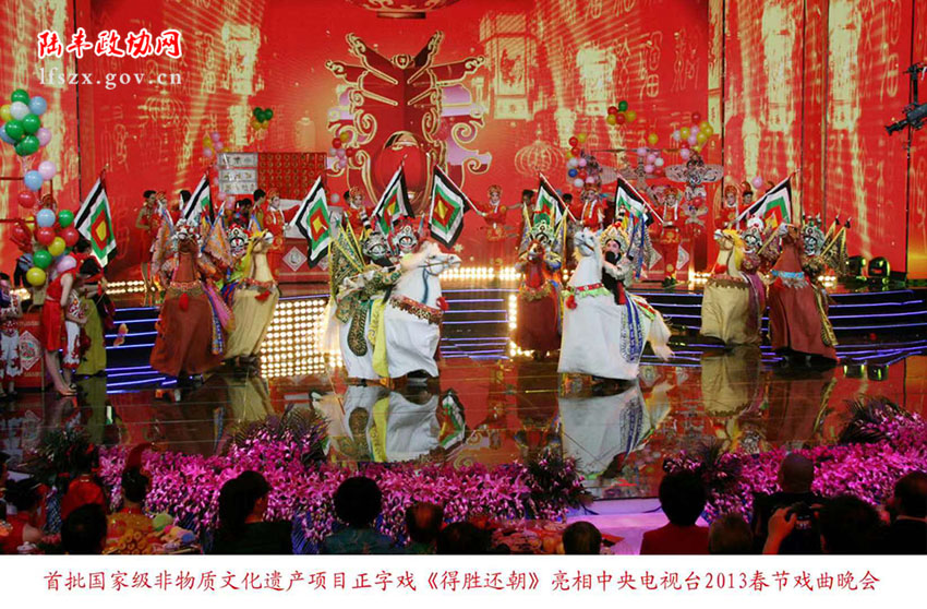 應(yīng)中央電視臺(tái)邀請(qǐng),正字戲以中國戲曲絕活“跑布馬”《得勝還朝》精彩亮相2013年央視戲曲春晚。