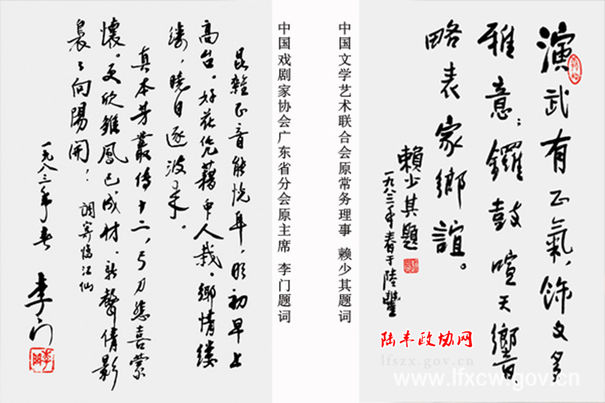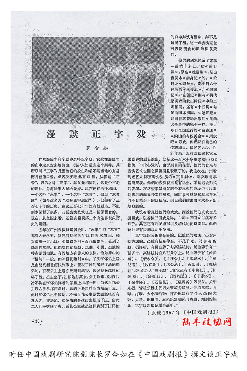 1954年,周恩來總理在省府禮堂觀看了正字戲《百日緣》,主演陳寶壽、蔡十二和音樂分別獲特別獎(jiǎng)和集體獎(jiǎng)。1956年夏,陳毅元帥等國家領(lǐng)導(dǎo)人和時(shí)任中國劇協(xié)主席田漢,在廣州觀看了正字戲《百日緣》《百花贈(zèng)劍》《古城會(huì)》的演出,并上臺(tái)親切接見,予以贊許和鼓勵(lì)。1957年文化部在廣州舉辦了第三屆中國戲曲演員講習(xí)班,正字戲《百花贈(zèng)劍》在講習(xí)班演出,被著名京劇導(dǎo)演阿甲、戲劇專家郭漢城選為教材,同時(shí)原中國戲劇研究院副院長羅合如還在《中國戲劇報(bào)》載文好評(píng),評(píng)說正字戲的音樂唱腔很好聽,表演優(yōu)美細(xì)致,有的地方有驚人的表演,恰如詩中的“警句”一般,還派女兒羅娜輝到雙喜正字劇團(tuán)即今陸豐市正字戲傳承保護(hù)中心學(xué)藝三年。