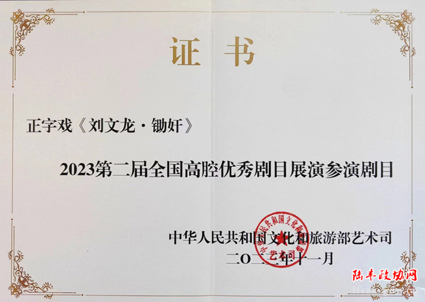 2023年11月,正字戲優(yōu)秀精品劇《劉文龍·鋤奸》一折,繼正字戲優(yōu)秀傳統(tǒng)劇目《織錦記·百日緣》參加首屆全國高腔優(yōu)秀劇目展演之后,入選第二屆全國高腔優(yōu)秀劇目展演,于11月8日在撫州市臨川大劇院展演。