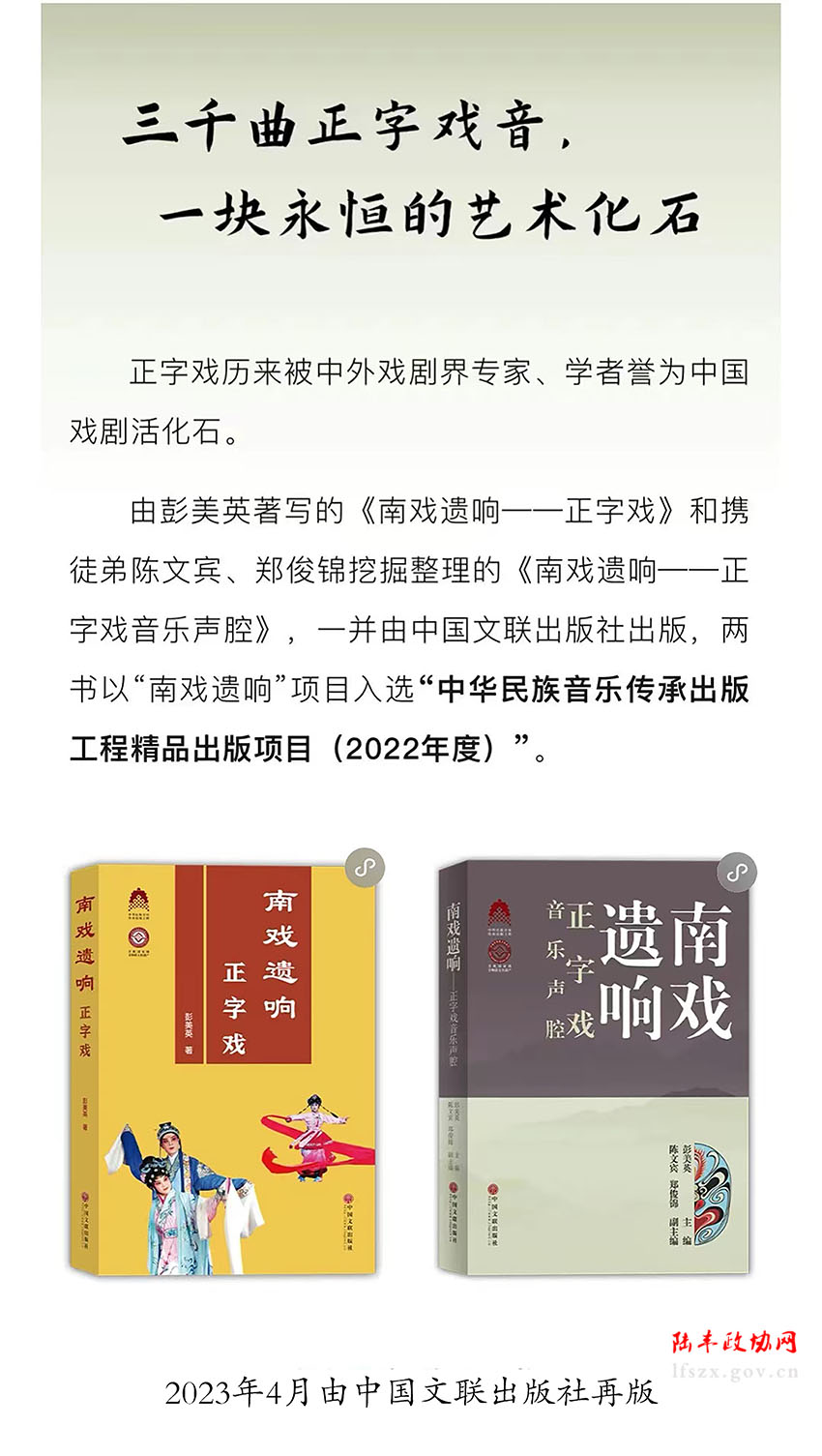 由國家級(jí)非物質(zhì)文化遺產(chǎn)正字戲代表性傳承人彭美英著寫、出版的《正字戲》(2009年版)(2015年版)及《南戲遺響—正字戲》(2021年版)、《正字戲臉譜》(第一編者)、《南戲遺響—正字戲音樂聲腔》(主編)等5本圖書,是正字戲集舞臺(tái)實(shí)踐、藝術(shù)創(chuàng)研、傳承發(fā)展于一體的藝術(shù)叢書和正字戲代代相傳的教科書,為中國戲曲史和宋元南戲研究提供了翔實(shí)有力的重要依據(jù),作出了重大貢獻(xiàn);2021年版的《南戲遺響——正字戲》及攜其徒弟陳文賓、鄭俊錦挖掘整理出版的《南戲遺響—正字戲音樂聲腔》以“南戲遺響”項(xiàng)目入選“中華民族音樂傳承出版工程精品出版項(xiàng)目(2022年度)”,于2023年4月由中國文聯(lián)出版社再版。 其本人入選文化部“中華優(yōu)秀傳統(tǒng)藝術(shù)傳承發(fā)展計(jì)劃”2016年度戲曲專項(xiàng)扶持項(xiàng)目“名家傳戲——當(dāng)代戲曲名家收徒傳藝”工程,傳承、導(dǎo)演正字戲優(yōu)秀傳統(tǒng)劇目《刺梁驥》《百花贈(zèng)劍》,是當(dāng)時(shí)全省入選的四個(gè)劇種之一(粵劇關(guān)國華、潮劇姚璇秋、漢劇梁素珍、正字戲彭美英);2023年被評(píng)為“首屆汕尾市文藝獎(jiǎng)終身成就獎(jiǎng)”。