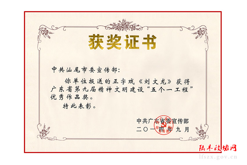 根據(jù)明宣德七年正字戲古劇本《劉希必金釵記》整編、打造的正字戲精品劇《劉文龍》于2014年榮獲廣東省第九屆精神文明建設(shè)“五個(gè)一工程”優(yōu)秀作品獎(jiǎng),同年11月獲第十二屆廣東省藝術(shù)節(jié)優(yōu)秀劇目二等獎(jiǎng), 2014年6月24日《劉文龍》全劇在中央電視臺(tái)戲曲頻道“九州大戲臺(tái)”播出,2015年10月入選中央電視臺(tái)《多劇種百臺(tái)精品大戲薈萃展播》。