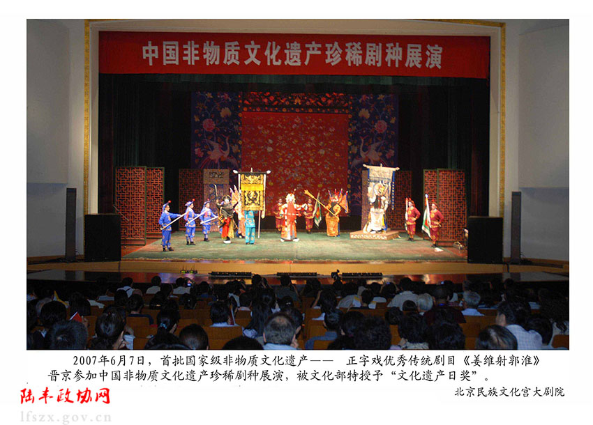 2007年6月7日,正字戲作為廣東省的唯一代表,以優(yōu)秀傳統(tǒng)劇目《姜維射郭淮》晉京參加中國非物質(zhì)文化遺產(chǎn)珍稀劇種展演,榮獲首屆中國“文化遺產(chǎn)日獎(jiǎng)”,并受到文化部、中國藝術(shù)研究院和中國非物質(zhì)文化遺產(chǎn)保護(hù)中心領(lǐng)導(dǎo)、專家的高度贊譽(yù),認(rèn)為廣東正字戲的跑布馬“富有中國戲曲形成之初的寫實(shí)風(fēng)格,古樸厚拙”,是“中國戲曲初生之際的藝術(shù)遺留”,“更是中國戲曲藝術(shù)的珍貴財(cái)富”。該劇在央視戲曲頻道播出。