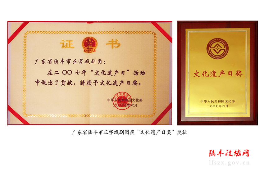 正字戲于2006年6月被中華人民共和國國務(wù)院公布列入首批國家級(jí)非物質(zhì)文化遺產(chǎn)名錄;2007年11月被廣東省人民政府公布列入省級(jí)非物質(zhì)文化遺產(chǎn)名錄。歷史上曾涌現(xiàn)過著名正字戲表演藝術(shù)家陳寶壽及著名藝人黃學(xué)明、劉彩等。現(xiàn)有國家級(jí)傳承人2名,省級(jí)傳承人3名、汕尾市級(jí)傳承人8名。